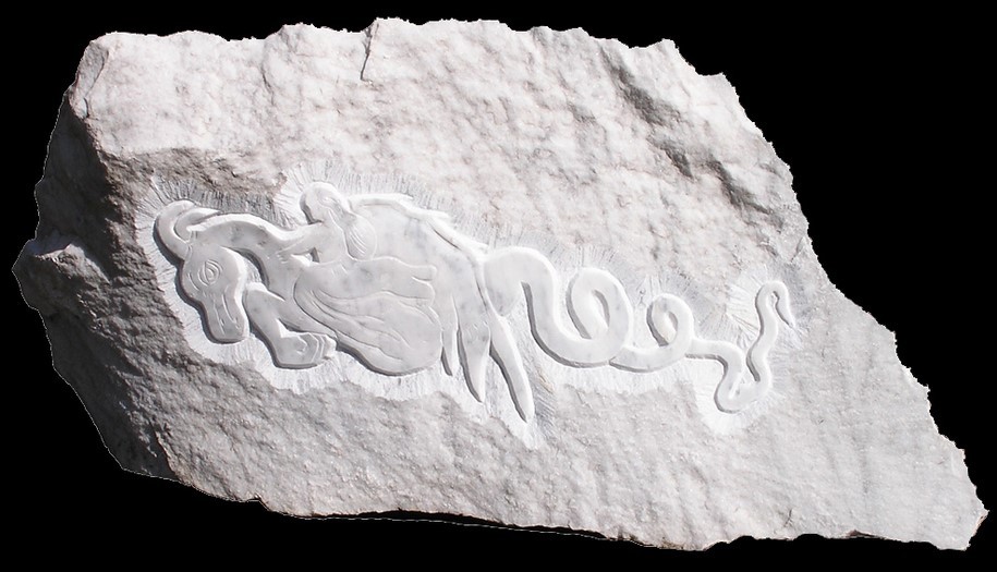 Femme au dragon, selon G. DoréFemme chevauchant un dragon,Selon une gravure de Gustave Doré.Marbre de Carrare. 32x65x12 cm