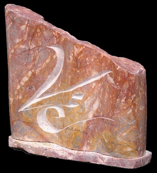 Une sorte de parchemin enroulé sur deux rouleaux, en marbre du Maroc.