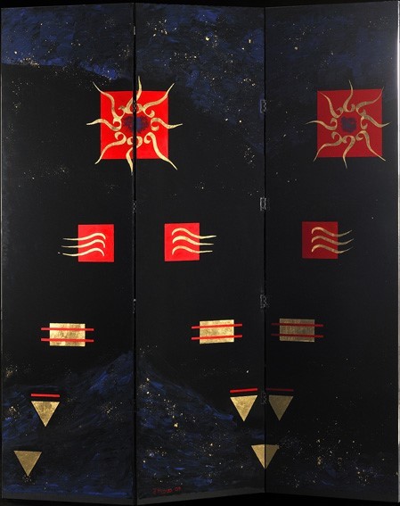Paravent. Bois, 3 panneaux 180x50cms.Laques, or. Dos en acrylique noir.